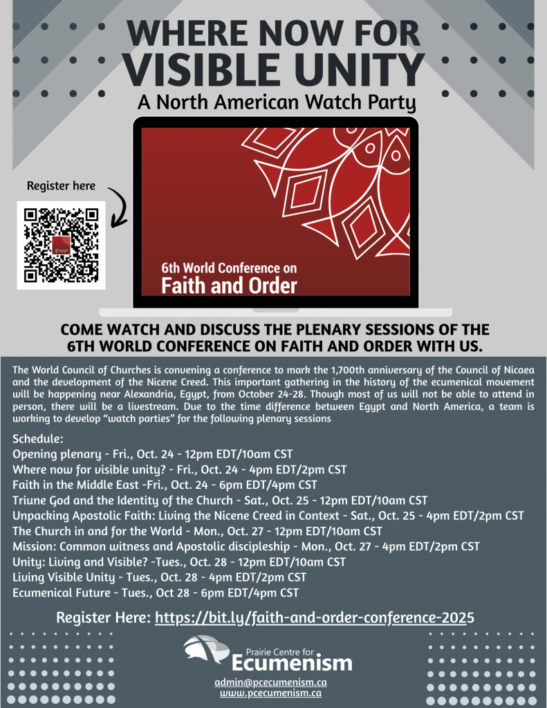 The World Council of Churches is convening a conference to mark the 1,700th anniversary of the Council of Nicaea and the development of the Nicene Creed. This important gathering in the history of the ecumenical movement will be happening near Alexandria, Egypt, from October 24-28. Though most of us will not be able to attend in person, there will be a livestream. Due to the time difference between Egypt and North America, a team is working to develop “watch parties” for the plenary sessions. Times listed on the poster below!